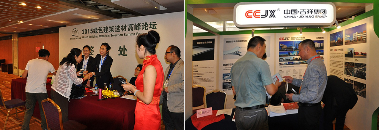 作为本次会议主协办单位,中国·吉祥集团董事长助理陆晏在会上就《绿色建材 企业的责任》向与会嘉宾做了生动的社会责任宣讲,中国·吉祥集团致力于研发节能,环保、科技的新生代绿色换代产品,发展绿色产品,服务社会、贡献社会的责任和行动。作为建材行业的领航者,本次会议也将我司新研发的“铝波纹芯复合铝板”作为绿色产品在本次绿色选材会中全面展示。在下午的新产品发布中。我司新产品高级工程师文曲就“铝波纹芯复合铝板”的产品性能及研发经历、产品优势向参会嘉宾做了详细的介绍和汇报,场外中国·吉祥集团的产品展示厅,前来参观咨询的设计师、开发商、专家络绎不绝,我们耐心细致的向各位参观嘉宾介绍我们的绿色新产品“铝波纹芯复合铝板”,通过深入的了解与交流,设计师与开发商对我司的新产品也赞不绝口,达成了今后合作的初步意向。
